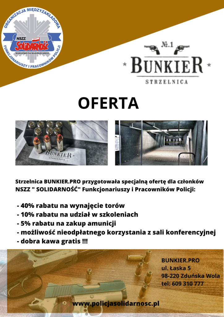 Strzelnica BUNKIER.PRO przygotowała specjalną ofertę dla członków NSZZ ”SOLIDARNOŚĆ” Funkcjonariuszy i Pracowników Policji: