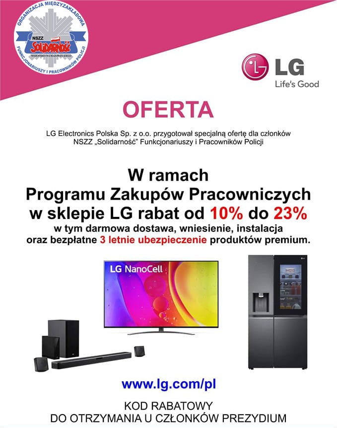 LG Electronics Polska sp. z o.o. w ramach współpracy z NSZZ Solidarność przygotował Program Preferowanych Zakupów Pracowniczych w sklepie www.lg.com/pl.