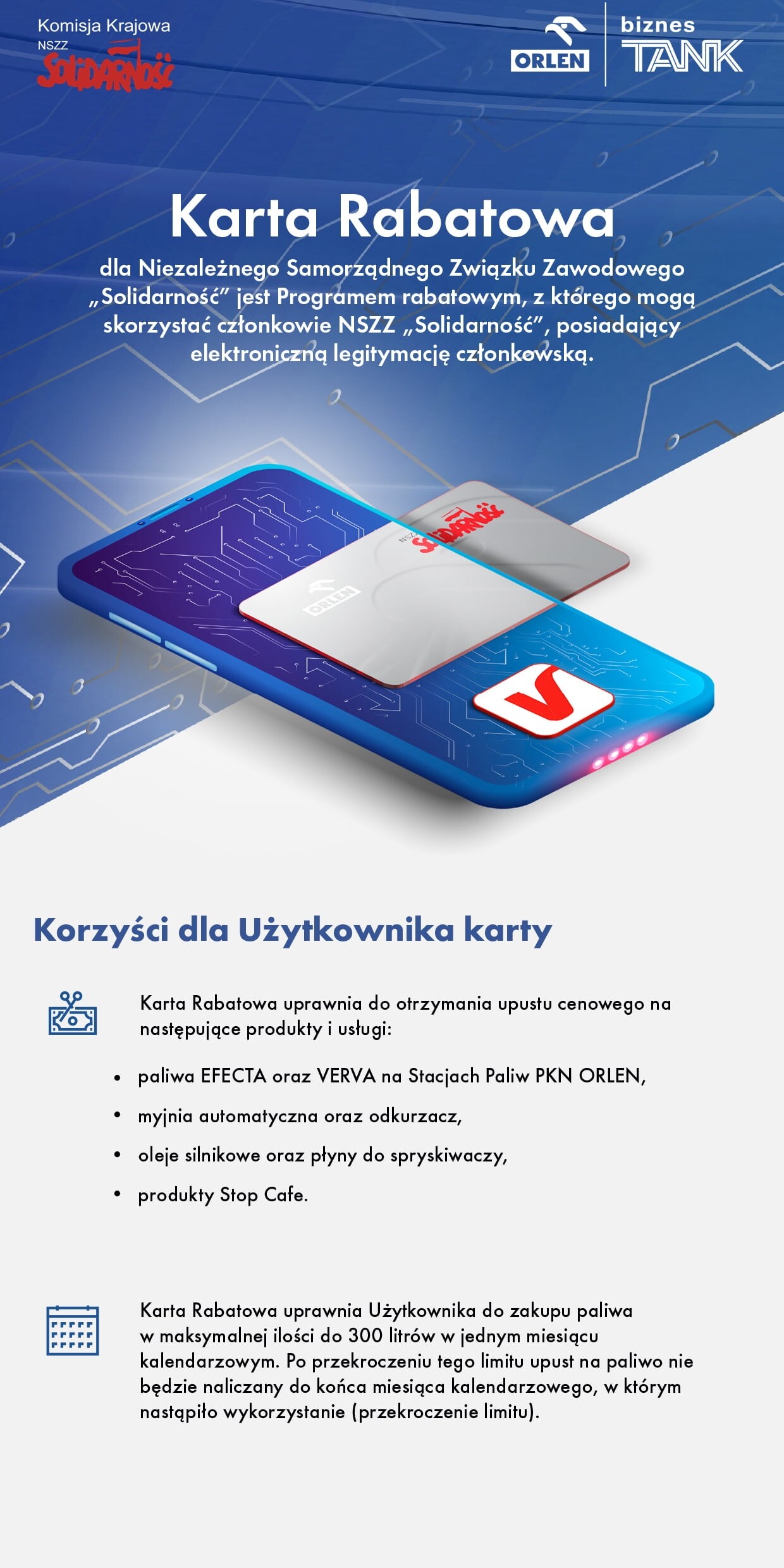 Paliwowa Karta Rabatowa ORLEN uprawnia do zakupu paliwa z rabatem cenowym w maksymalnej ilości 300 litrów w miesiącu kalendarzowym na jeden pojazd.