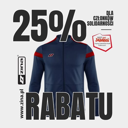 Dla członków zrzeszonych w Sekretariacie Służb Publicznych NSZZ „Solidarność” przygotowano specjalny rabat 25% na produkty marki ZINA – producenta profesjonalnej odzieży sportowej.